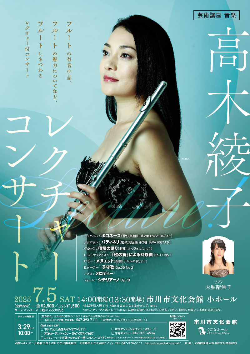 高木綾子は、確かなテクニックと、個性溢れる音色、ジャンルを超えた音楽性で、今最も注目を集める実力派フルート奏者である。