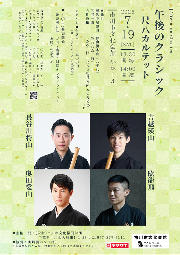 | 曲目 | 初代中尾都山/都山流本曲《八千代》 三宅一徳/失われた「時」 永井秀和/”ゐる”杜 一尺八寸管尺八四本のための ほか |