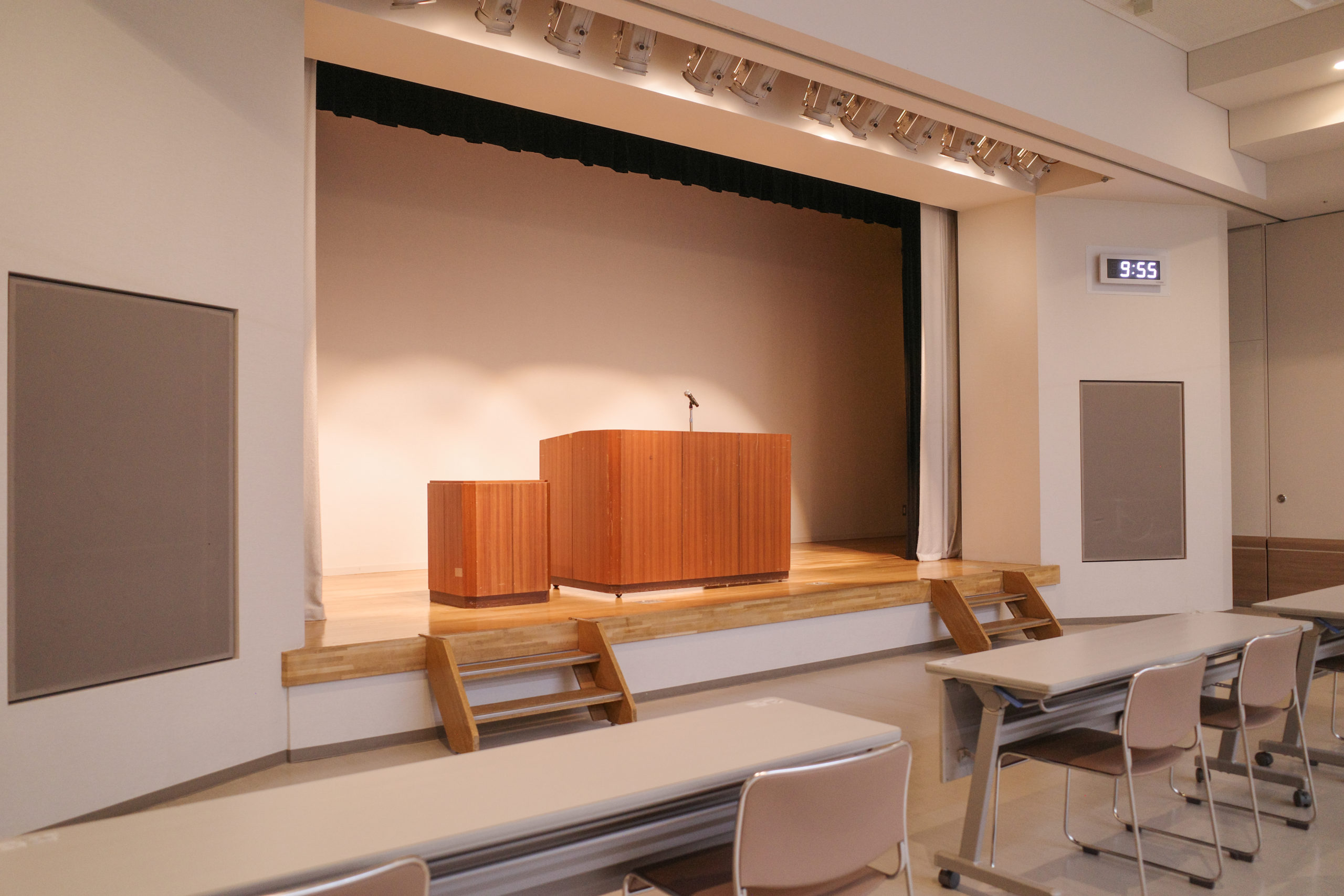 | 有料備品 | 音響設備(マイク、CD他) 照明設備(スポットライト他) ピアノ(ヤマハ<セミコン>)/ピアノ椅子(背有3、背無1) その他(演台、司会者台他) |