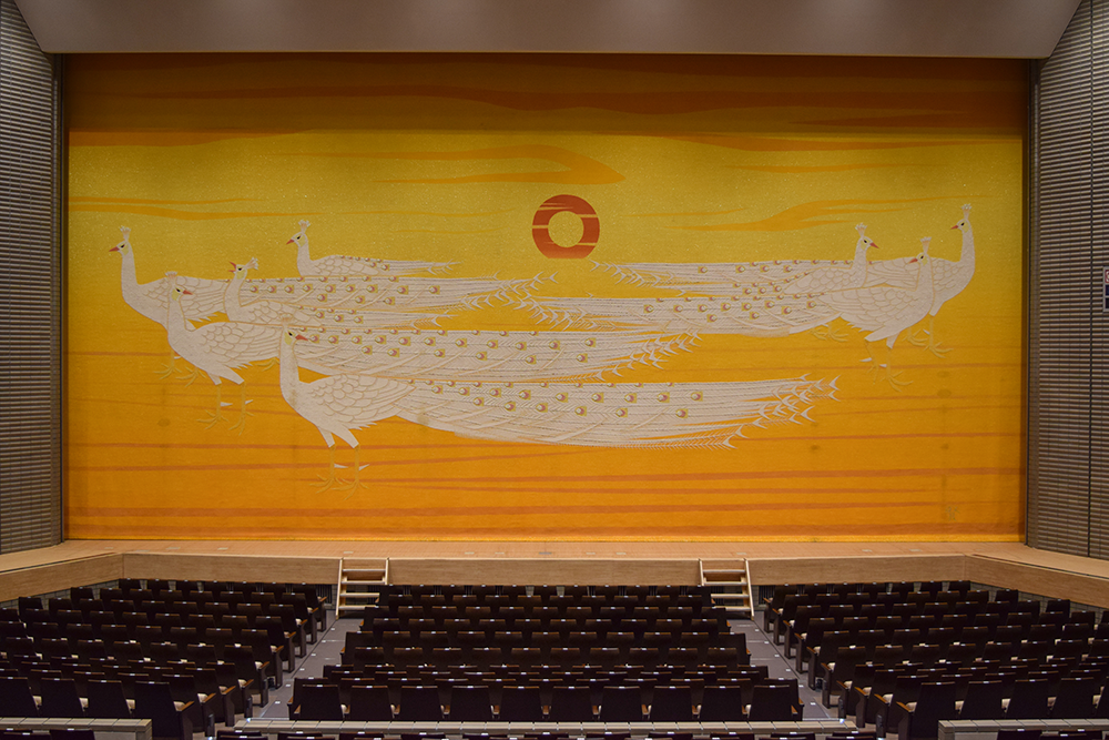 また舞台緞帳は、原画東山魁夷氏の第1緞帳「題:緑の微風(そよかぜ)」と原画佐治賢使氏作の第2緞帳「題:暁(あかつき)に集う」によって構成されており、当文化会館の“顔”としてひときわ美しく光彩を放っています。